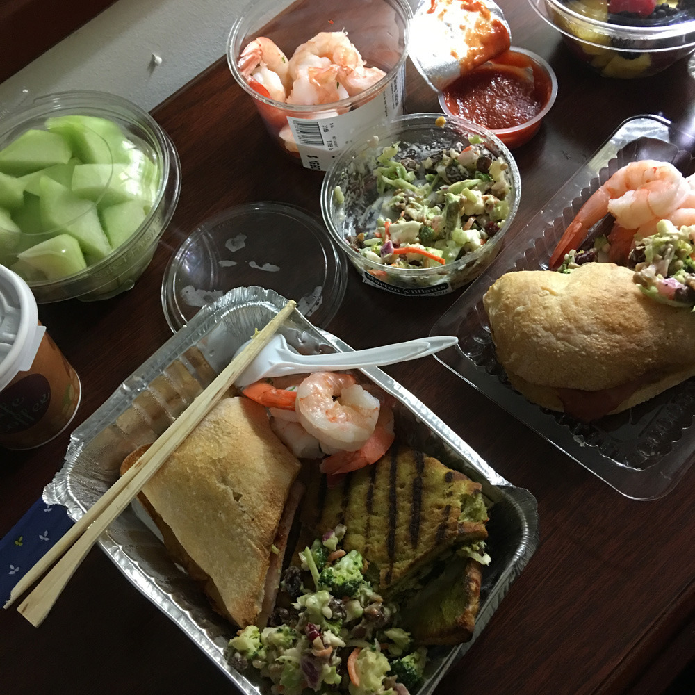 トレーにサラダやメインディッシュ、果物デザートまで好みの量を取る事が出来、量り売りで精算する。