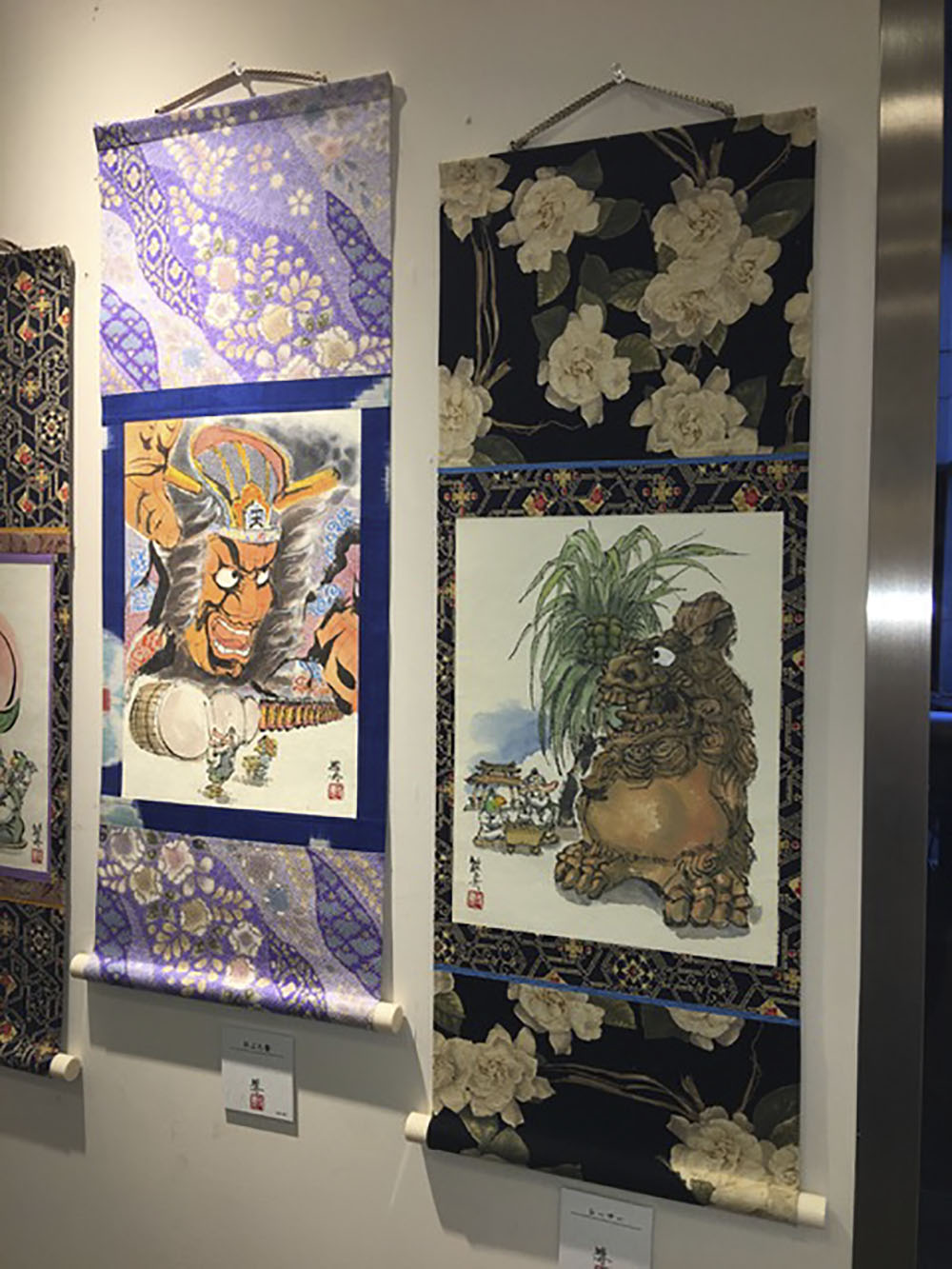 世界遺産を描いた墨絵の手作り掛け軸が多数並ぶ会場は、なかなかの迫力!